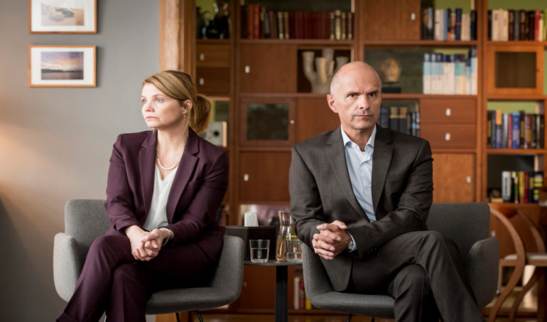 Comedy aus Deutschland? Nee Danke, geht gar nicht! Dieser Spruch ist glücklicher Weise Vergangenheit, denn seit einer Weile haben es die deutschen Medien tatsächlich geschafft, mutig zu sein und neue Wege einzuschlagen. Stellvertretend dafür seien “Der Tatortreiniger” oder “Arthurs Gesetz” genannt. In der neuen Serie “Merz gegen Merz” treffen nun Annette Frier und Christoph Maria Herbst, als trennungswilliges Ehepaar Anne und Erik aufeinander. Obwohl, ganz so trennungswillig sind sie eigentlich nicht, zumal neben der persönlichen Verbindung auch der geschäftliche Aspekt eine große Rolle bei den beiden spielt. Denn Erik ist in der Firma von Schwiegervater der Mann fürs Grobe und wird gerade dringend benötigt, da bei Papa die Demenz die Herrschaft übernimmt…