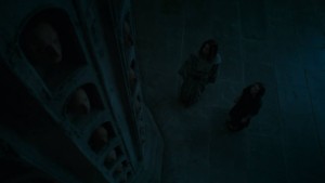 In Essos geht es ebenfalls hoch her. Arya scheint in ihrem Training stetig Fortschritte zu machen, denn nach dem unerlaubten Mord an Merryn Trant wird ihr endlich wieder ein richtiger Auftrag zugeteilt. Sie soll eine Schauspielerin töten, die, in einem amüsant inszenierten Bühnenstück über Joffreys Machtergreifung mitspielt. Beim Zusehen zeigt sie aber trotz, dass sie Arya Stark angeblich hinter sich gelassen hat, sehr viel Unmut über die Parodien ihrer ehemaligen Familie. Vielleicht ist der Brunnen im House of Black and White einfach untalentiert darin, Menschen einzuschätzen und sie ist doch noch nicht „niemand“. Zurück im Tempel teilt sie Jaqen dann auch noch ihre Zweifel über ihren Auftrag mit. Arya hat das Prinzip der Faceless Men offensichtlich immer noch nicht ganz begriffen. Die Geschichtsstunde über die Entstehung des Ordens hingegen ist sehr schön. Es ist kein Wissen, dass man zwingend braucht, aber Wissen, das durchaus interessant ist.
