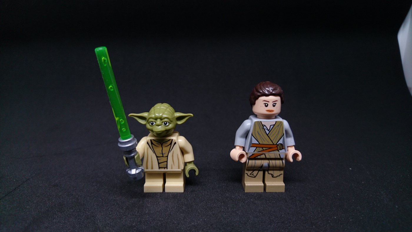 Yoda ist eine kleine Minifigur. Das heißt, er hat nicht das “normale” Beinstück, das sich biegen lässt. Stattdessen hat er die kürzeren, unbeweglichen Beine, die sonst hauptsächlich Kinder-Minifiguren bekommen. Und Hobbits. Rey ist NICHT im Set enthalten! Nur zum Größenvergleich im Foto!