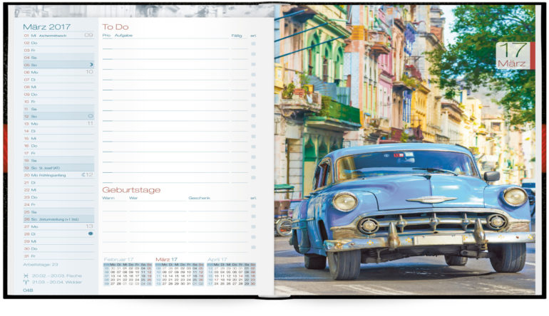 Der „Chäff-Timer“ orientiert sich an den modernen Trends und bietet schon von außen eine verspielte Optik, die sich im Inneren fortsetzt. Der Monat beginnt jeweils mit einer Monatsübersicht, einer To-Do-Liste und Geburtstagen, jede Woche bietet einen kompakten Überblick, Raum für Notizen und eine kleine informative Geschichte. Die besonderen Features zeigen sich erst auf den zweiten Blick. So finden sich z.B. die Mondphasen und die Sternzeichen im Kalendarium. Darüber hinaus bietet der „Chäff-Timer“ viele Bonusseiten, etwa für Projektmanagement, Wochenpläne, Aufgaben- und Zensurenlisten, die Nahverkehrpläne von Berlin, Hamburg und München und weiter viele nützliche Dinge. Ein feines, kleines Wunderbuch.